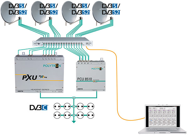POLYTRON’s switch matrix ESM 1716 flexibly supplies SAT IF and terrestrial signals to signal processing and distribution systems, monitoring and recording systems as well as test stations.